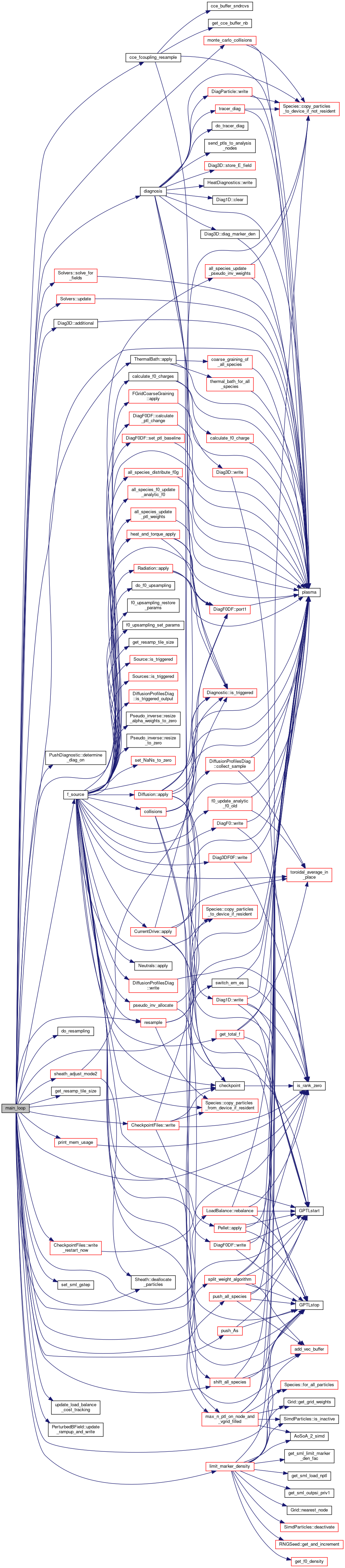 void main_loop (int istep, Simulation< DeviceType > &sml, const MagneticField< DeviceType > &magnetic_field, Plasma &plasma, Neutrals< DeviceType > &neutrals, LoadBalance &load_balance, DomainDecomposition< DeviceType > &pol_decomp, const Grid< DeviceType > &grid, Sheath< DeviceType > &sheath, Solvers &solvers, ElectricField< DeviceType > &electric_field, PerturbedBField< DeviceType > &perturbed_B_field, Sources &sources, Smoothing &smoothing, Diagnostics &diagnostics, Charges &charges, VelocityGrid &vgrid, DMWrapper &pseudo_inv_dm, CheckpointFiles &checkpoint_files)